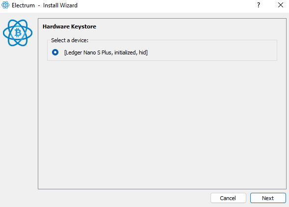 5. Chọn Use a hardware device → Next. Đảm bảo thiết bị Ledger đã được mở khóa và đang mở ứng dụng Bitcoin.