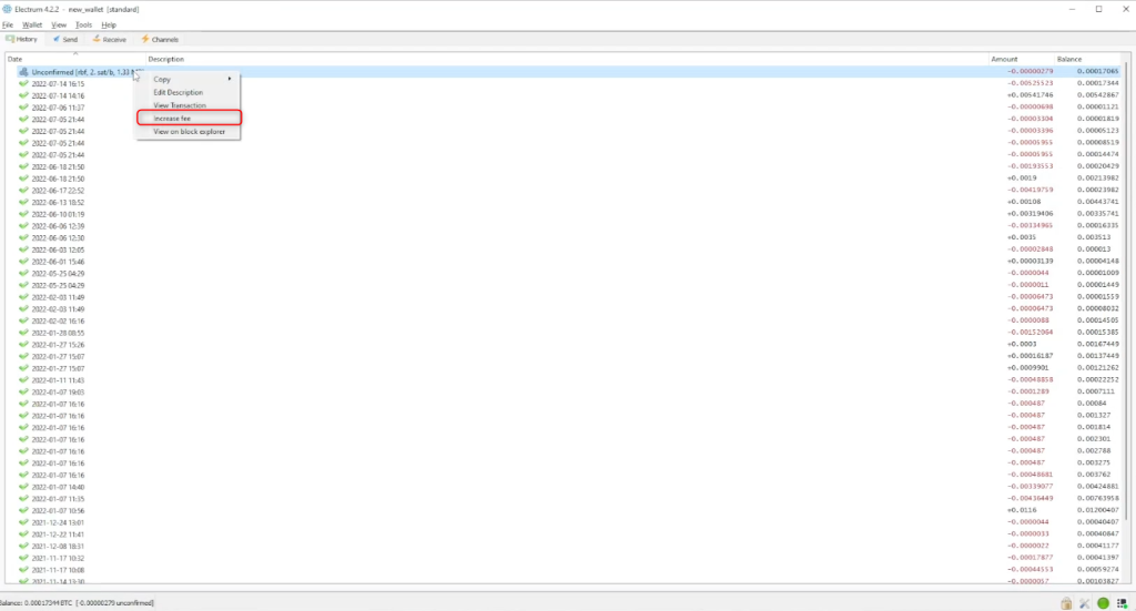 9. Nhấp chuột phải vào giao dịch bị “kẹt” (unconfirmed) → Increase fee.