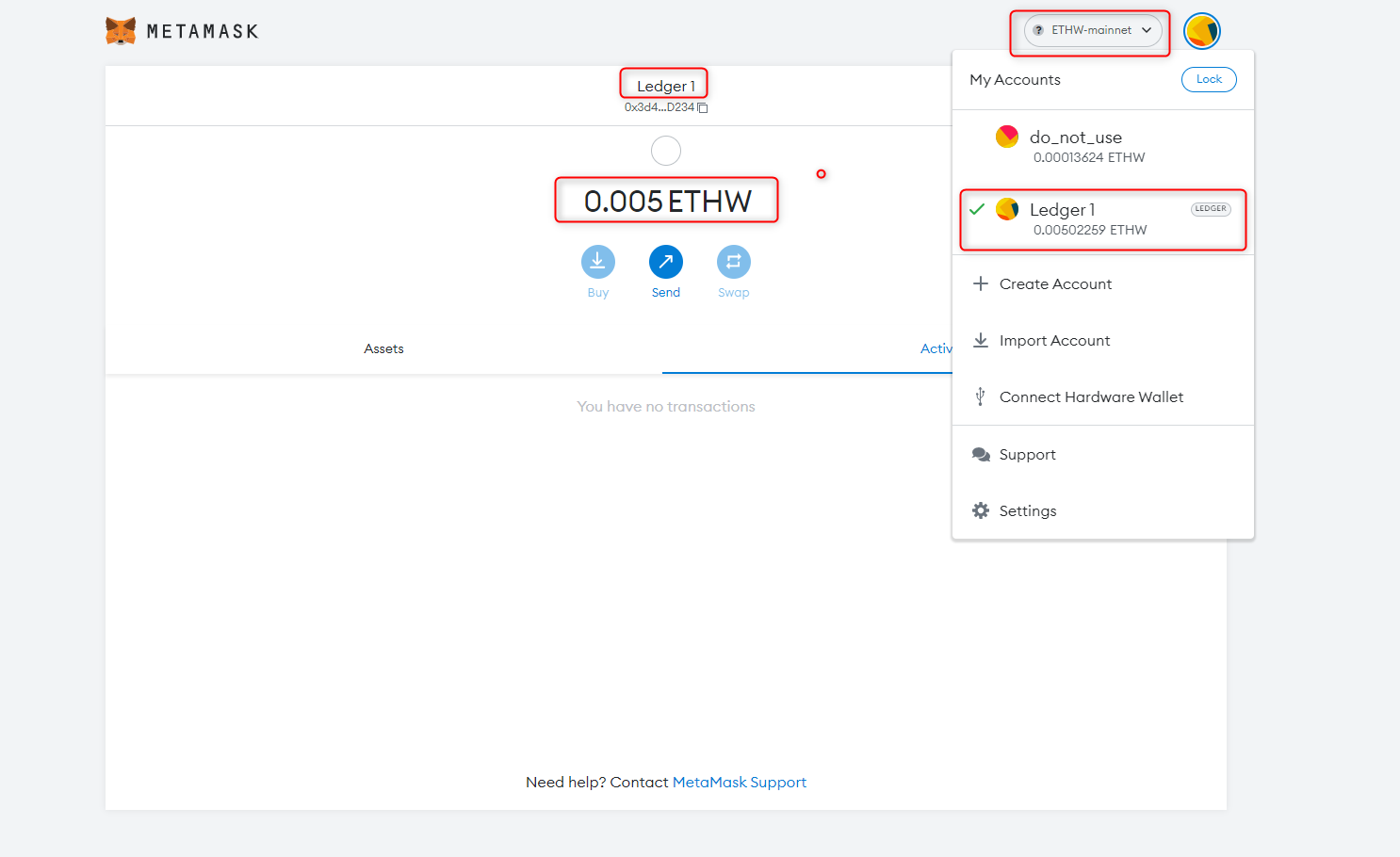 Tài khoản Ledger Ethereum POW (ETHW) của bạn và số dư ETHW sẽ hiển thị trong MetaMask.