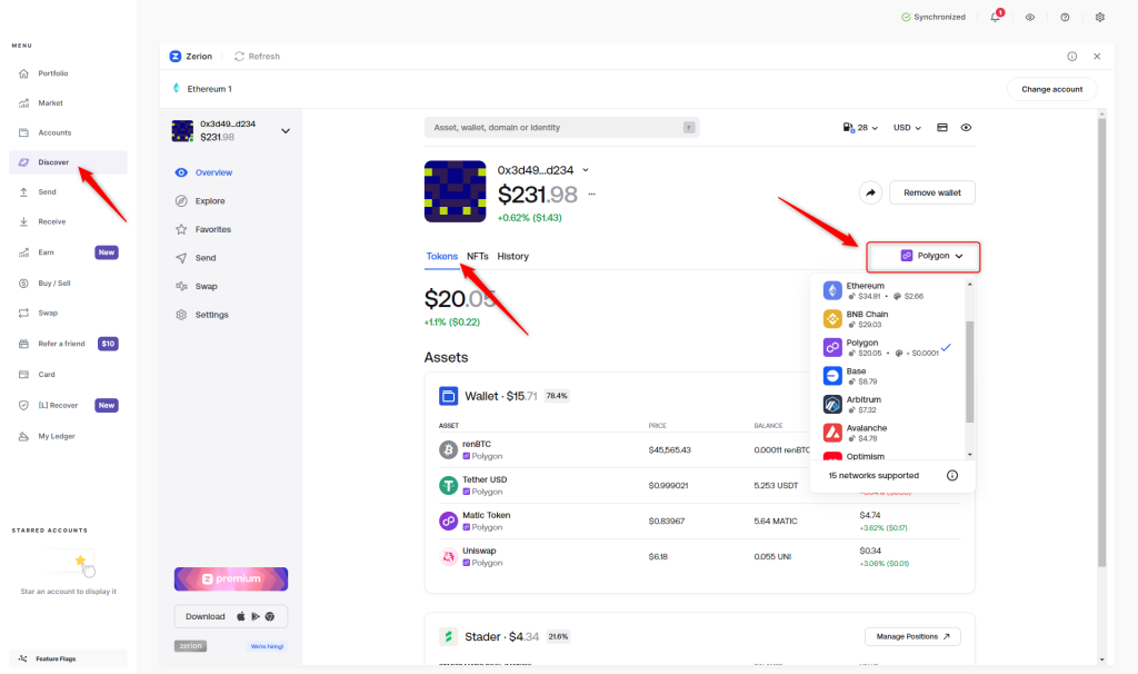 Zerion là công cụ quản lý danh mục đầu tư (portfolio manager) mạnh mẽ, dành cho các tài khoản thuộc hệ sinh thái EVM (Ethereum Virtual Machine), bao gồm: Ethereum (ETH), Polygon (POL), Arbitrum (ARB), Optimism (OP Mainnet), Base, Binance Smart Chain (BNB). Zerion thường hiển thị nhiều loại token ERC20 và BEP20 hơn Ledger Wallet. Truy cập Zerion thông qua mục Discover (Khám phá) trong Ledger Wallet. Khi đã vào được Zerion, chọn blockchain mạng tương ứng và truy cập mục Tokens để xem token được lưu trữ trong tài khoản Ledger của bạn.