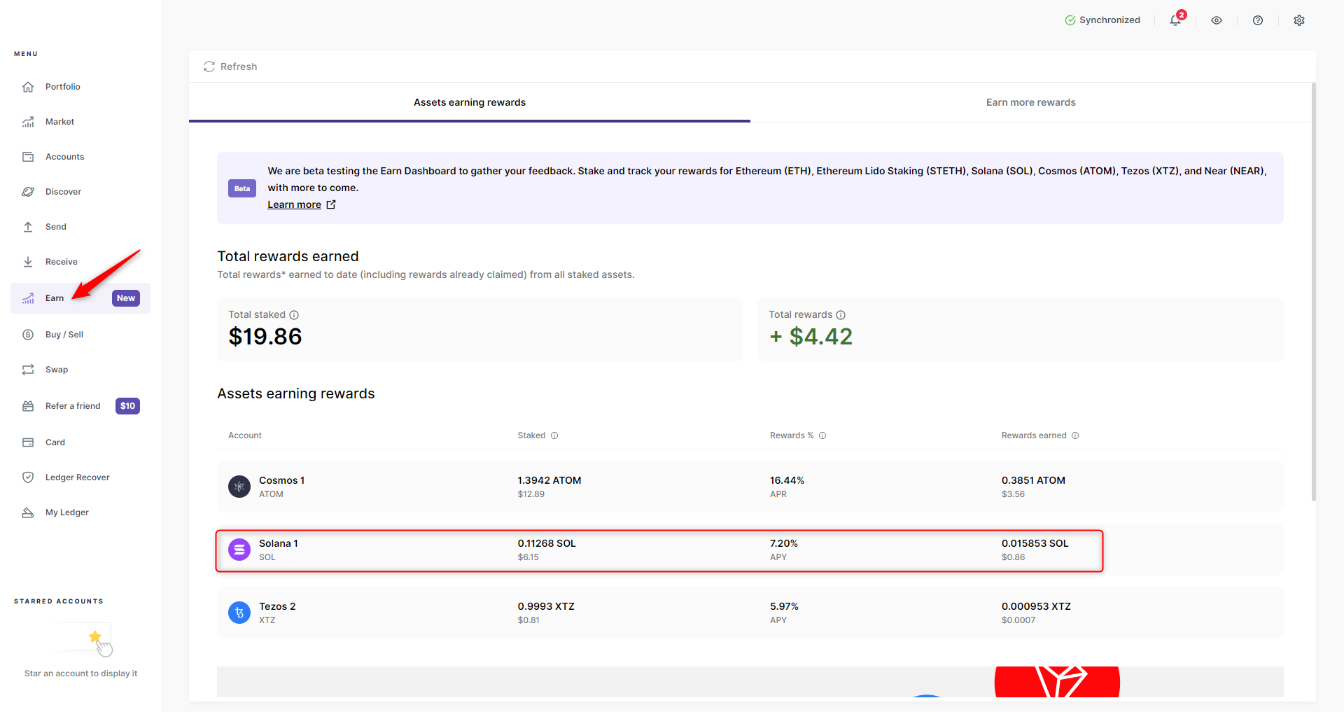Theo dõi phần thưởng staking SOL bằng bảng điều khiển Earn trong Ledger Wallet