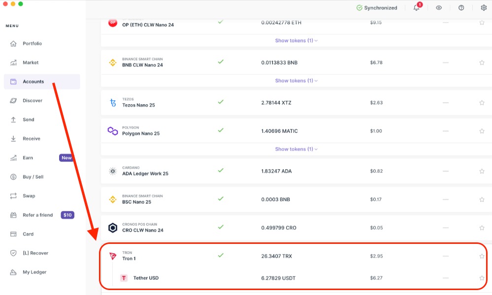 - Nếu bạn đã có tài khoản Tron có chứa token, các token này sẽ tự động hiển thị trong Ledger Wallet sau khi bạn thêm tài khoản Tron.