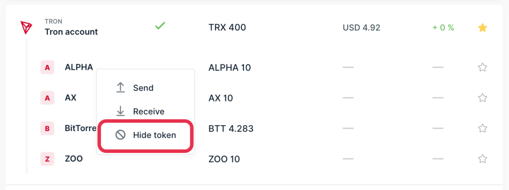 - Trong trang Accounts, nhấn chuột phải vào token muốn ẩn.