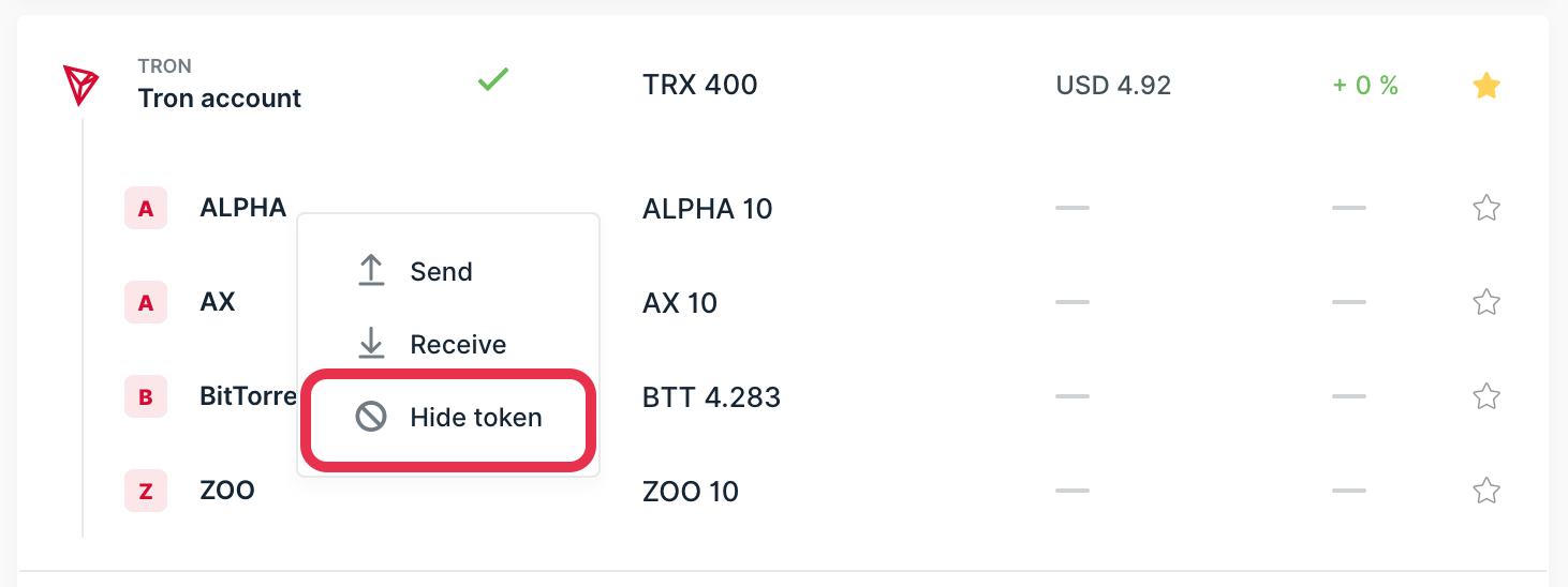 - Để hiển thị lại, vào Settings > Accounts > Hidden tokens (Cài đặt > Tài khoản > Token đã ẩn).