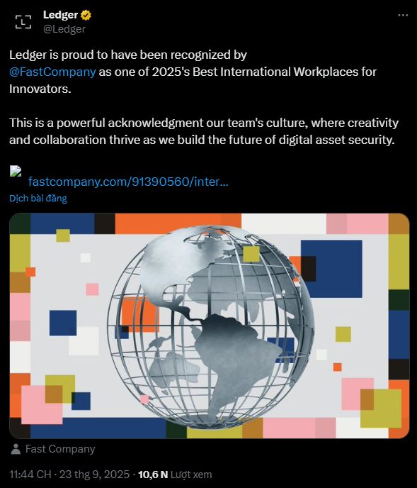 Mới đây, Ledger – thương hiệu ví lạnh hàng đầu thế giới đã chính thức lọt Top “Best International Workplaces for Innovators 2025” do Fast Company bình chọn. Thành tích này không chỉ khẳng định văn hóa sáng tạo mạnh mẽ mà còn trở thành động lực để Ledger tiếp tục dẫn đầu trong lĩnh vực bảo mật tài sản số toàn cầu.