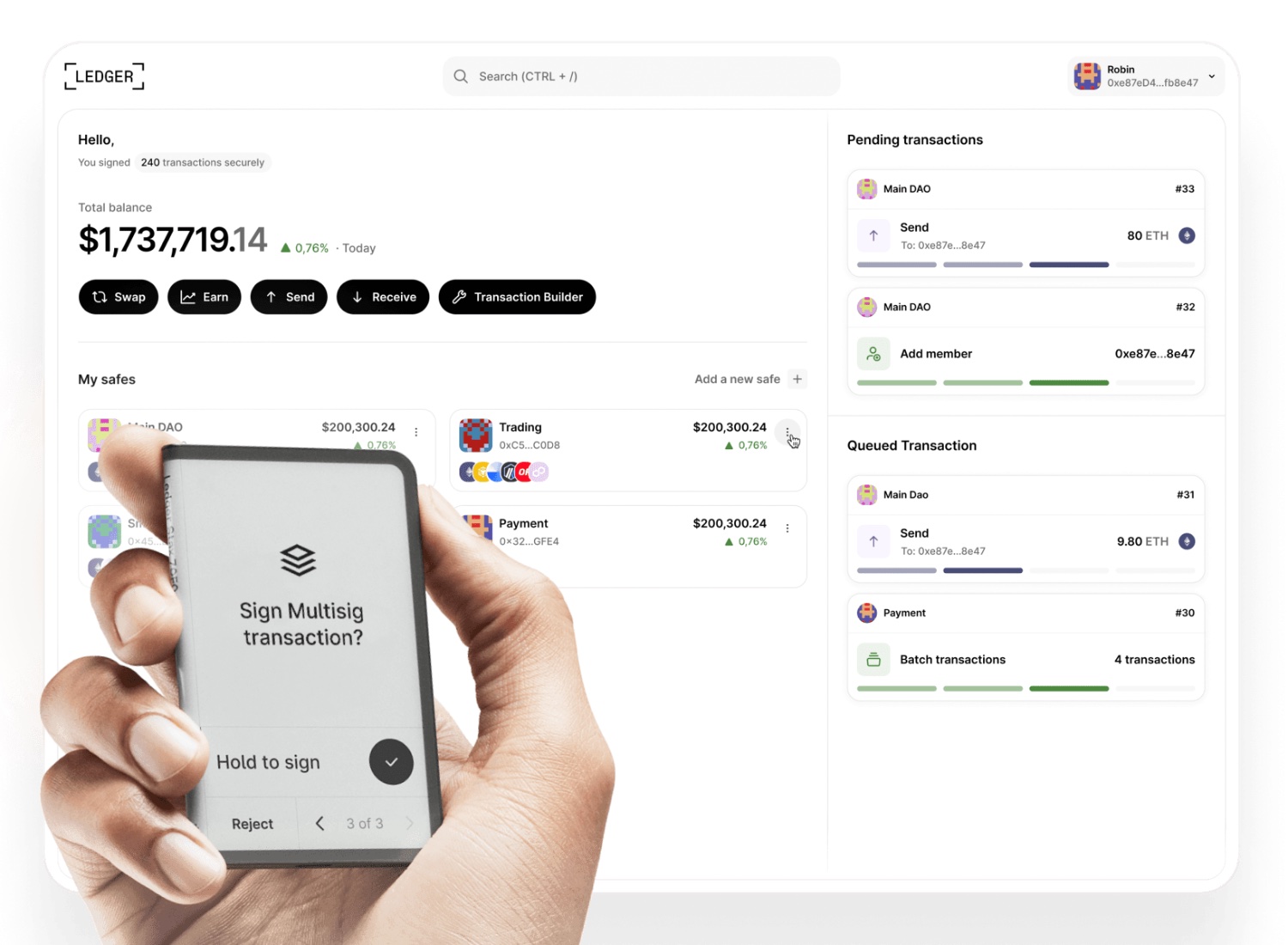 Quản lý tài sản on‑chain giá trị lớn và quỹ chung bằng cách bắt buộc nhiều thiết bị Ledger cùng phê duyệt trước khi một giao dịch được thực hiện.