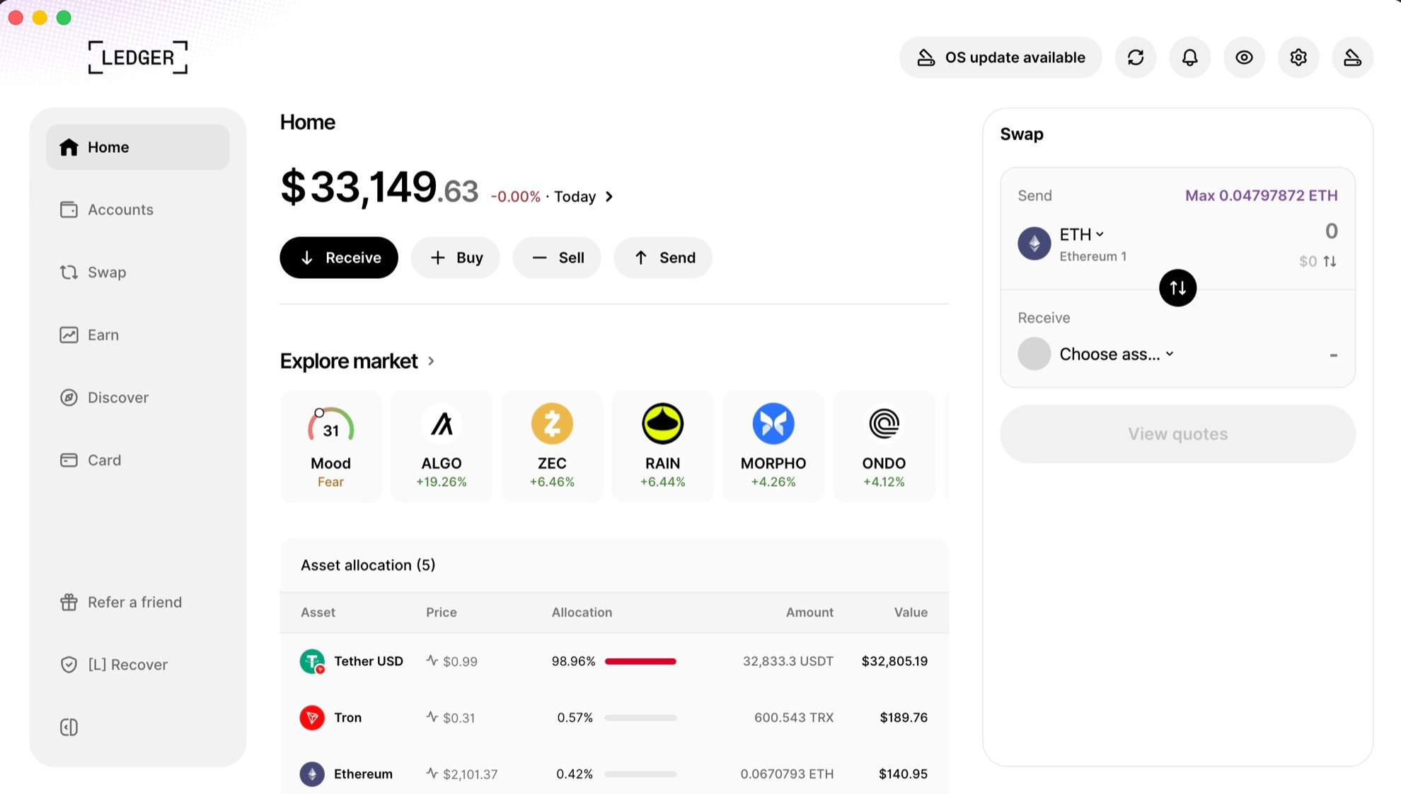Ledger Wallet 4.0 mang đến nhiều cải tiến rõ rệt về trải nghiệm người dùng. Giao diện được thiết kế lại theo hướng trực quan hơn, giúp việc theo dõi danh mục đầu tư trở nên dễ dàng. Nhờ đó, bạn có thể nắm bắt nhanh biến động thị trường cũng như các token nổi bật…